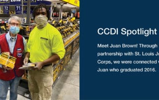 Meet Juan Brown! Through our partnership with St. Louis Job Corps, we were connected with Juan who graduated as president of his class from the program in 2016. Since graduating, Juan has been interested in furthering his skills in the electrical pathway. CCDI wanted to help make that happen and recently helped to get Juan hired as an apprentice electrician at Power Up with The UP Companies. Congrats, Juan! We had the opportunity to visit Juan on site at the Delmar Divine project to see how things were going. Mentorship is an important part of the program and we wanted